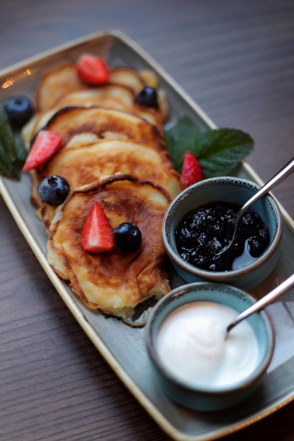 Syrnyky with fresh berries, sour cream and homemade jam