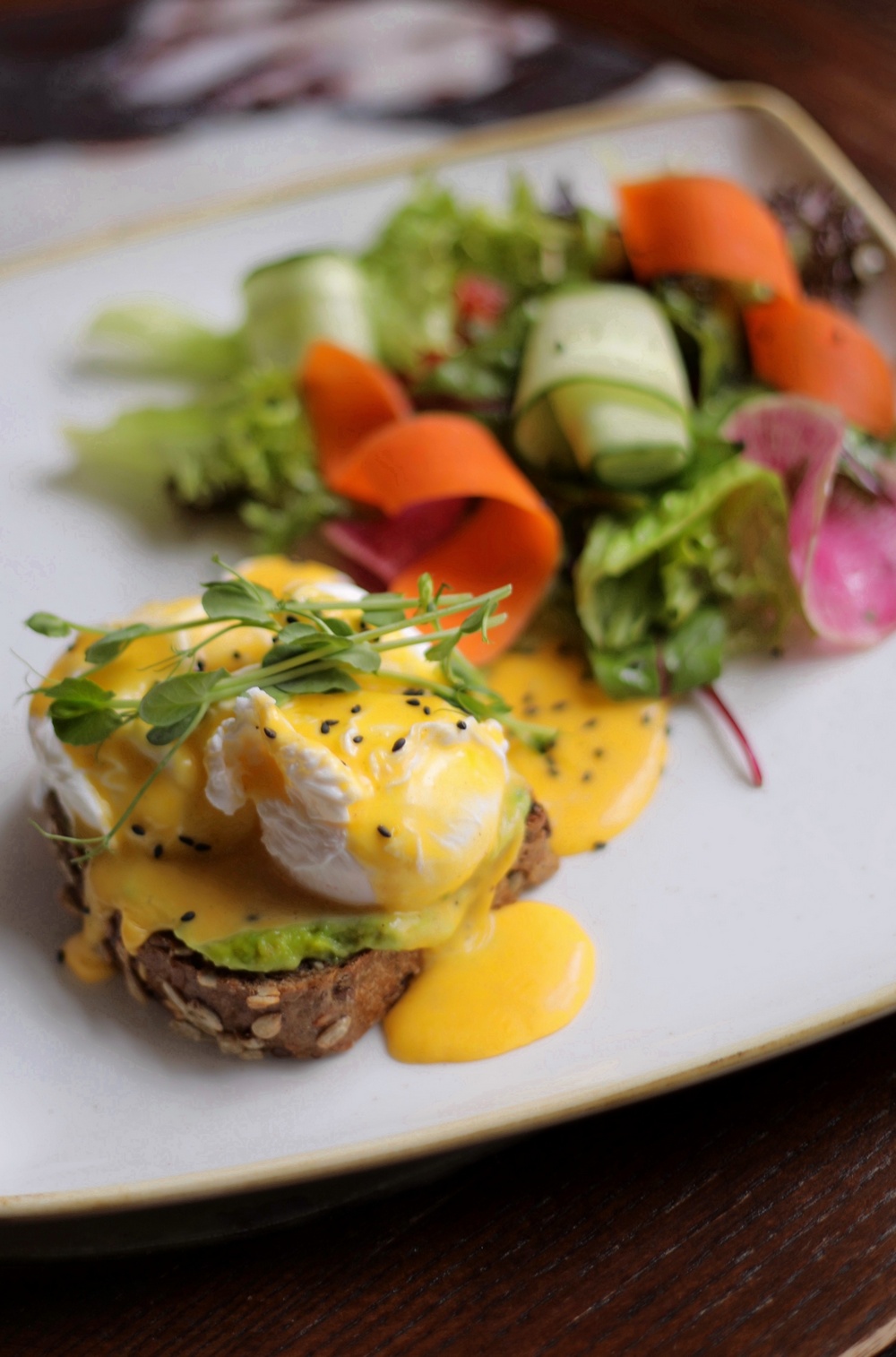 Poached eggs with avocado cream and fresh salad