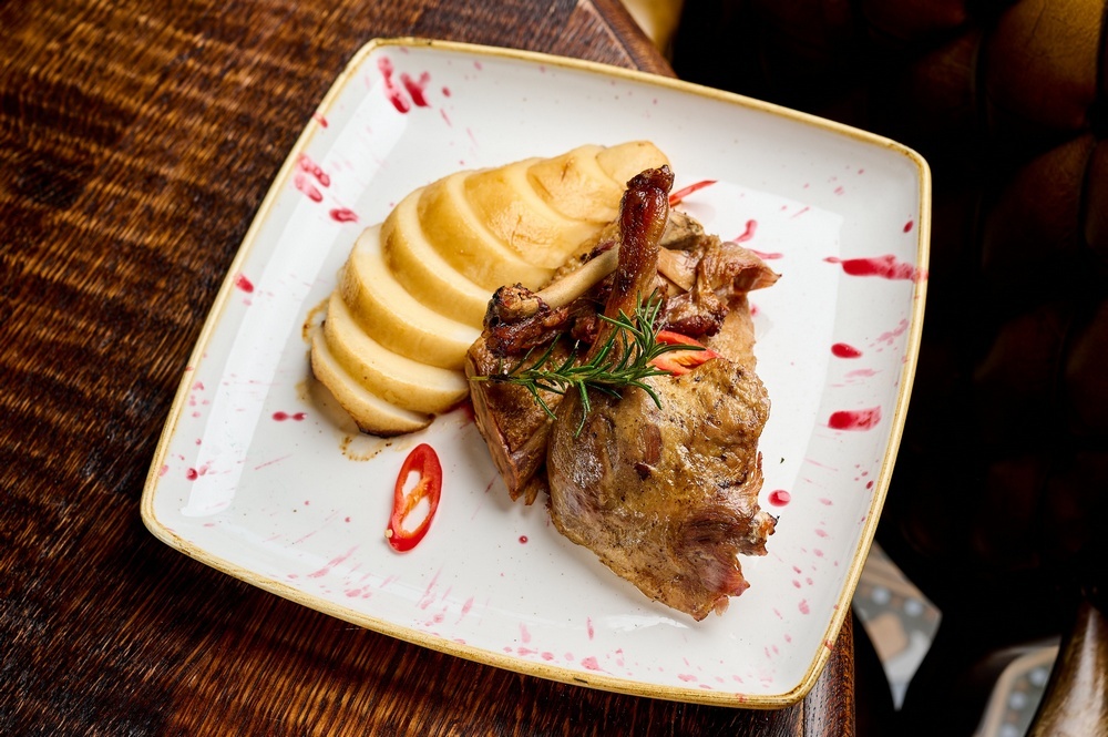 Качка конфі з грушею і сливовим соусом